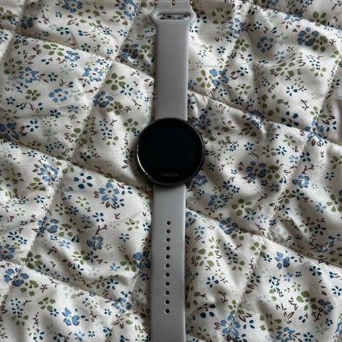 Selger en pent brukt Samsung Galaxy Watch5 (40mm) med lilla silikonreim.