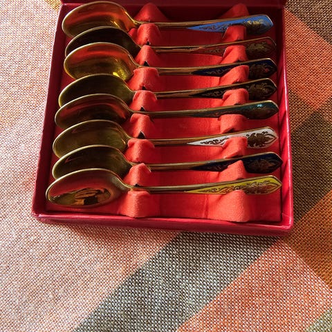 Stikkord: Th. Marthinsen, sterling, 925, sølvskjeer, mokkaskjeer, kaffeskjeer, emalje, forgylt, Tønsberg, original eske
