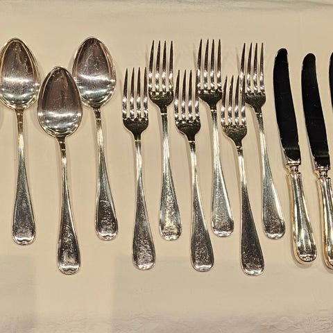 Pent og klassisk sett med 12 små skjeer fra Th. Marthinsen, Tønsberg. Skjeene passer godt som mokkaskjeer/ kaffeskjeer, og leveres i originalt etui. Hver skje er stemplet “Th. Marthinsen Sterling Norway”, som tilsier sterling sølv (925). Skålene har gyllen finish (forgylt innside), og skaftene har blå emalje, i to variasjoner, som gir et tidstypisk og elegant uttrykk.