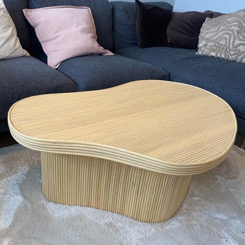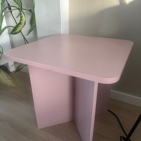 Ovalt sofabord i rosa farge gis bort.