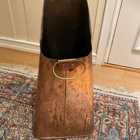 Antikk koks bøtte i kobber. Bøtten har bærehåndtak med lyse dekorative detaljer og står på rund fot. Formen er høy og avlang med helletut i front. Egnet som vedbøtte ved peis eller som dekorativ gjenstand i interiøret.