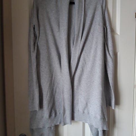 Cubus cardigan for dame i størrelse L. Cardiganen er grå og strikket i 100 % bomull. Modellen har v-hals, lange ermer og knepping med knapper foran. Passer til hverdagsbruk og kan brukes over topper, skjorter eller kjoler for et ekstra lag.