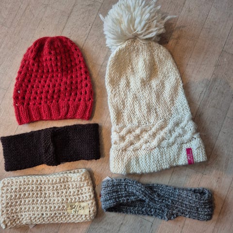 Rosa strikket hals kr 50. Strikket pannebånd 75 pr stk. Luer gis bort ved annet kjøp.