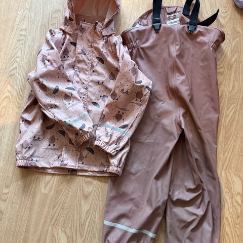 Regnsett fra Lindex str 110, to bukser og en jakke. Settet er pent brukt ingen hull. Noe slitasje på strikk til og ha rundt skoen.