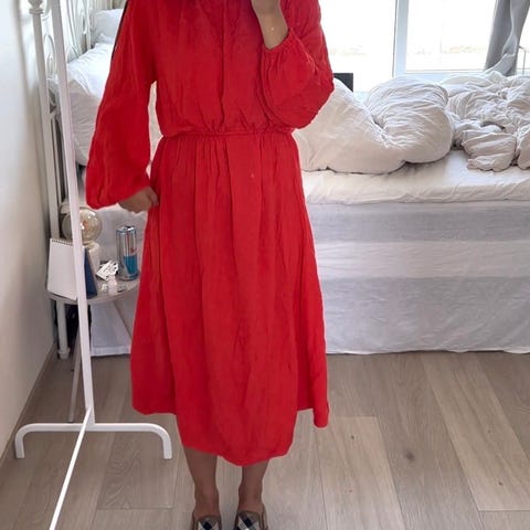 Shein hverdagskjole i størrelse S for dame. Lang rød kjole i polyester med lett struktur i stoffet. Modellen har lange ermer med strikk ved håndleddene og v-utringning. Livet er lett innsnevret og skjørtet er sydd i flere lag/volanger som gir en løs og komfortabel passform. Egnet som hverdagskjole eller til enkle anledninger.