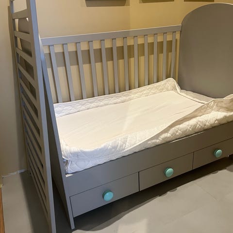 Juniorseng opprinnelig hvit men vi malte den i blanding av grå/lilla, sterkere lilla på skuff. Noe maling er gått av men ingen skader. Trenger gjerne litt maling.