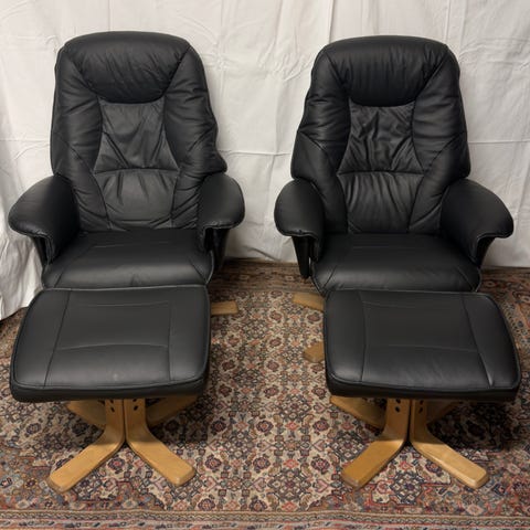 Selger 4 blå lenestoler med sving. Gode å sitte i. To har lav rygg (som på første bilde) mens to har høy rygg. De to høye kan lene seg lenger bakover.