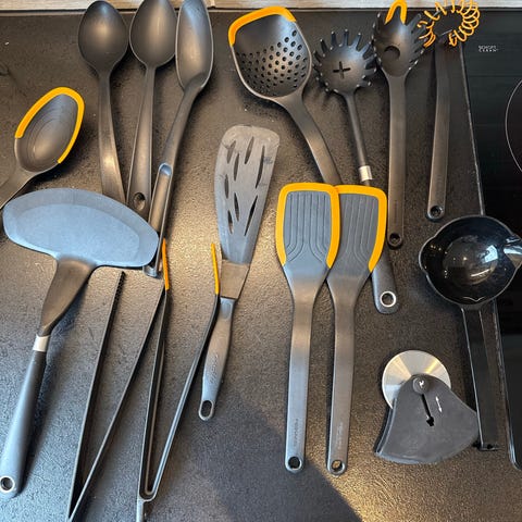 Fiskars Functional Form kjøkkenredskaper sett i svart og oransje. Settet består av ulike kjøkkenredskaper i plast. Litt brukt, selges samlet.