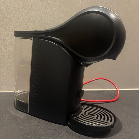 Kjøpt i januar 2025, brukt rens som er laget for maskinen ved behov. Følger med en halvfull flaske med rens og 30 kapsler Dolce Gusto Cortado.