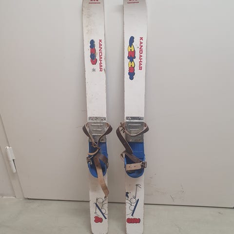 Barneski ca. 90 cm, for aldersgruppe 2-3 år til salgs. De har lærbinding med hælkappe og to reimer, så de kan brukes med vanlige vinterstøvler.