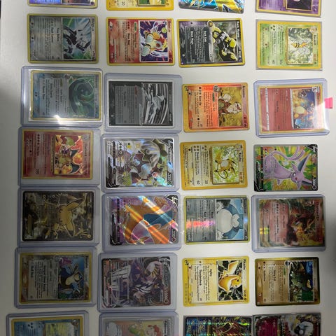 Pokémon kort samling med ulike motiver og figurer. Bildet viser flere forskjellige korttyper, inkludert vanlige, holo- og eventuelt full art-kort. Kortene har varierende illustrasjoner, elementtyper og design. Egner seg for samlere eller som tillegg til eksisterende kortstokk i Pokémon Trading Card Game. Antall, utgaver og språk på kortene fremgår ikke fullt ut av bildet og kan variere i samlingen.