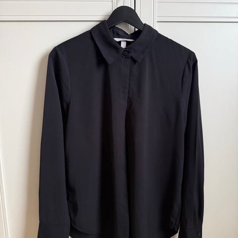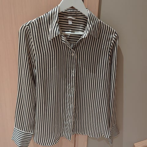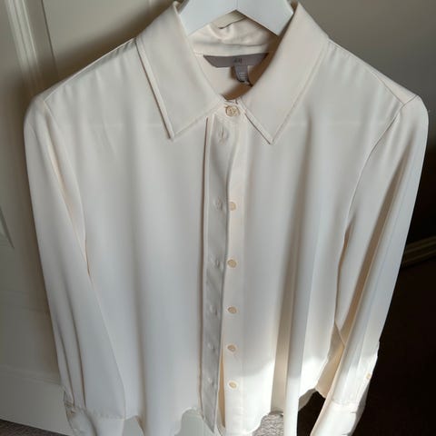 H&M skjorte for dame i størrelse S. Skjorten er hvit og laget av polyester. Den har klassisk krage, lange ermer med mansjetter og knappelukking foran. Passer til bruk i hverdagen eller til mer formelle anledninger. Materialet er lett og glatt, og plagget kan kombineres med både bukser og skjørt.