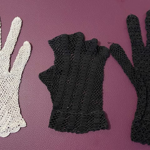Heklede selskapshansker. Offwhite farge, som har gulnet litt. Passer meg som bruker str 6 i hansker. Fra 1940-tallet.
