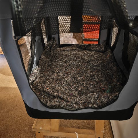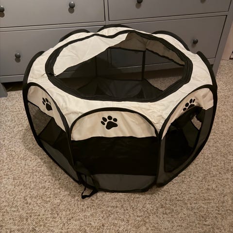 Sammenleggbart Hundebur / Valpebur i et slags glatt polyester stoff.