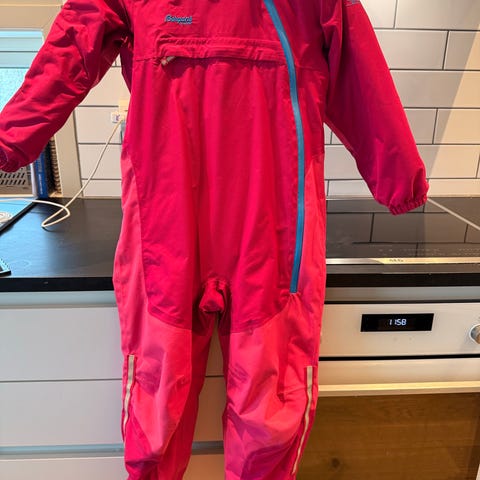 Bergans vinterdress romslig i str, beste dressene vi har hatt så godt brukt! Det er et lite hull på kneet som kan fikses med en lapp og er litt ødelagt på toppen av glidelåsen.