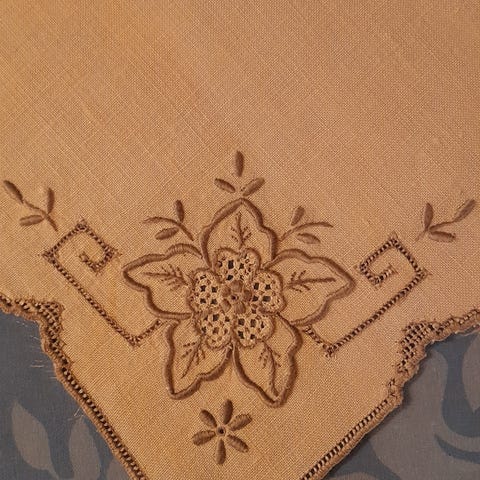 målene er 93 x 98 cm. Duken er renvasket og strøket. Jeg tror den er brodert på linstoff. Den har en liten kaffeflekk på blondekanten.