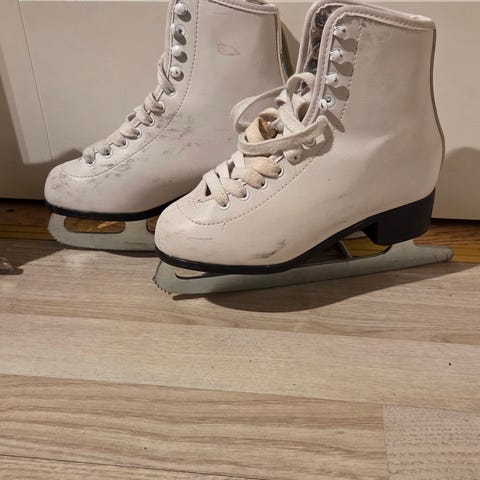 Kunstskøyter for barn i størrelse 33. Klassiske hvite skøyter med snøring. Blad i metall med tagger foran, egnet til generell skøytebruk på isbaner.