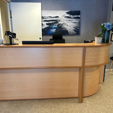 Resepsjonsdisk i grå utførelse. Diskens utforming gir en høy front mot kunde og lavere arbeidsflate på innsiden. Egnet som resepsjons- eller mottaksdisk i for eksempel klinikk, kontor eller butikk. Rette linjer og enkel, moderne stil. Logo på front skal fjernes