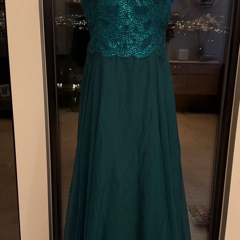 Ballkjole med paljetter over hele kjolen, stort skjørt. Knytting i ryggen,str30. Kan brukes med og uten stropper på skuldrene. Førpris 5500,-