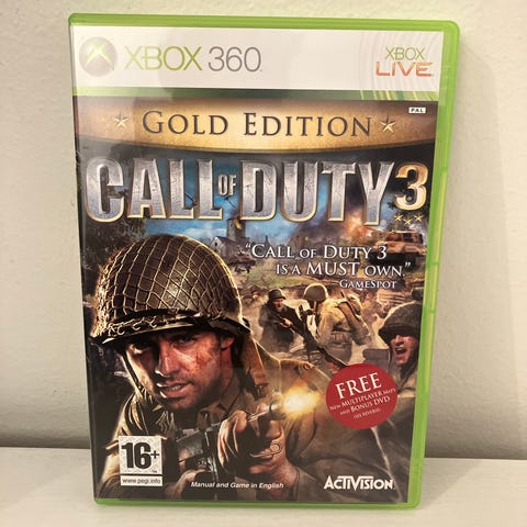 Begge titlene er førstepersons skytespill i Call of Duty-serien, utgitt av Activision for Xbox 360. Aldersmerking på omslagene viser 16+ for Call of Duty 3 og 18+ for Call of Duty Modern Warfare 3.