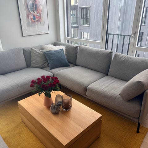 Jeg selger sofaen til førstemann som kan hente den. Det er heis og derfor ingen problem med bæring.