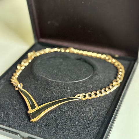 Monet smykkesett for dame i gullbelagt materiale. Smykket består av en kraftig lenke med klassisk ledddesign. Passer som halskjede til hverdagsbruk eller mer formelle anledninger. Laget i gullbelagt metall kombinert med andre materialer. Halskjedet er 60 cm langt og armbåndet er 20 cm.