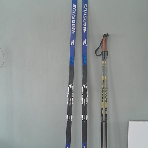 Ski i klassisk modell med blå og hvit dekor. Undersiden har tradisjonell såle til langrenn. Bindingene er manuelle Rottefella-modeller som passer til sko med tilsvarende Rottefella-system.