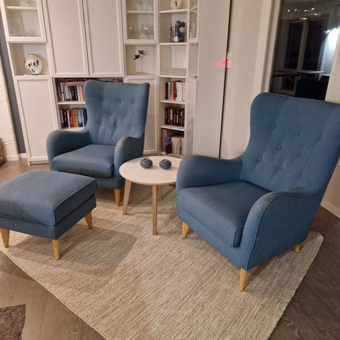 Godstoler til salgs med puff. Puffen har rom i seg. 1000kr per stol. Må hentes.