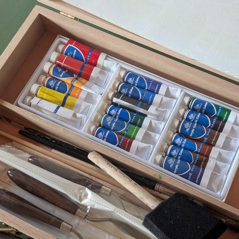 Ubrukte pensler. Lerret med emballasje på. Akrylmaling I massevis. Skuffen er ikke brukt av meg selv i det hele tatt. Kan også slenge med billig oljemaling fra clas Ohlson, men da må andre pensler brukes helst. (Men du bestemmer selvfølgelig)