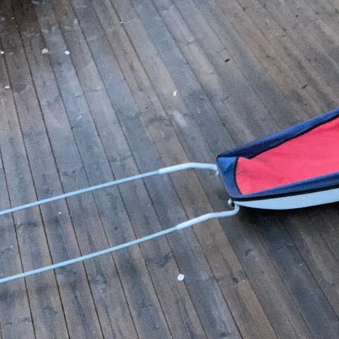 Pent brukt. Noen merker på skjermene og en liten rift foran, men ingenting som har betydning for bruken. Følger med sammenleggbart drag og sele.
