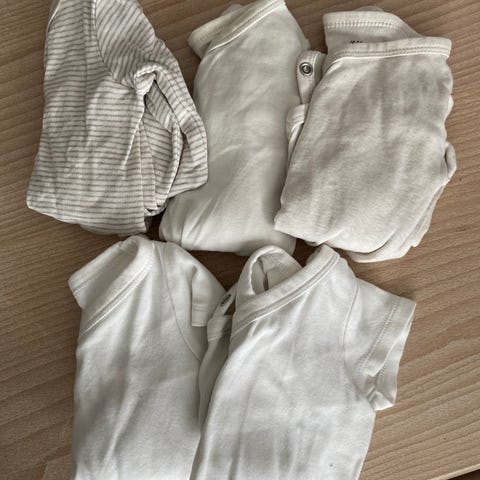 Liten klespakke i størrelse 56. 2 omslagsbodyer og 5 bukser.