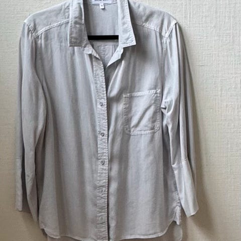 Vintage Cubus skjorte for dame i størrelse M. Skjorten er en dus mint farge og laget av viskose. Den har lange ermer, klassisk krage og knepping foran. Den har to falske brystlommer med klaff. Passer som en lett skjorte til hverdagsbruk eller lag-på-lag. Kjempe fine knapper. Den er i god stand, men mangler nederste knapp og har noe svarte merker som er på bildene. Kan hende de går vekk i vask.