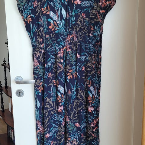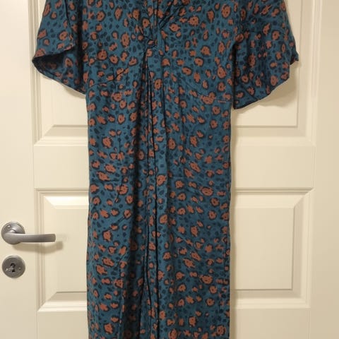 Gudrun Sjödén tunika/kjole . størrelse S for dame. Kjolen er laget av bomull og har et flerfarget mønster med ulike blader og former. Modellen har knapper foran og er knelang med ermer som rekker omtrent til albuen. Egner seg som hverdagskjole og kan brukes både inne og ute, alene eller med lag under og over avhengig av sesong.