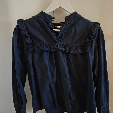 Jean Paul bluse for dame i størrelse L. Blusen er blå og laget av polyester. Modellen har lange ermer, knappelukking foran og klassisk kragefri utforming. Stoffet er lett og egner seg godt til både hverdagsbruk og mer formelle anledninger, avhengig av hva den kombineres med. Blusen kan brukes alene eller under jakke eller blazer.