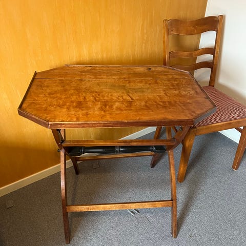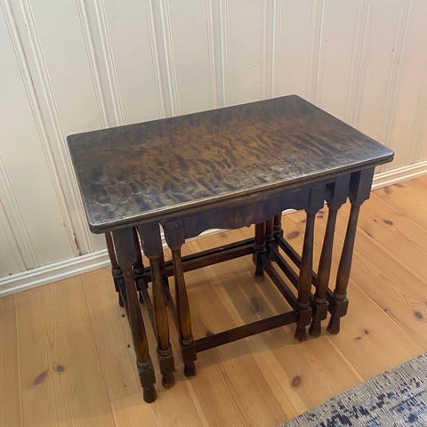 Sett med antikk tre bord i ulike størrelser som kan skyves inn under hverandre for plassbesparende oppbevaring. Fra 1920. Bordene har lyse treplater og mørkere, dreide ben. Passer som sidebord eller avlastningsbord i stue eller andre oppholdsrom. Mål på det største bordet er 50x35cm. Pakker godt og kan sendes. Selges kr 750,-(brst)