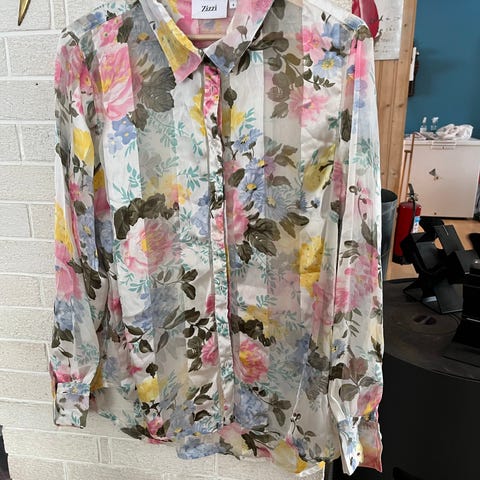 Monki skjorte for dame i størrelse 40. Skjorten er hvit med blomstermønster og har krage og lange ermer. Materialet er 100 % polyester. Passer som en lett, mønstret skjorte til hverdagsbruk eller jobb.