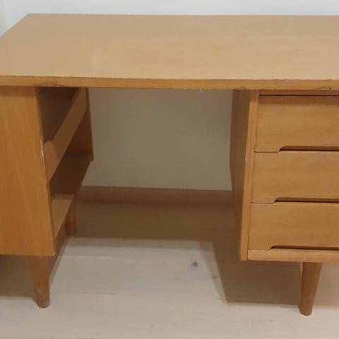 Solid skrivebord med fem skuffer. Trekket på stolen er håndsydd og helt. Bord og stol kan selges hver for seg. Samlet pris er kr. 2000,-. Kom med bud på hver del, og vi finner en løsning.