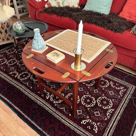 Selger et flott salongbord av Bruno Mathsson, produsert av Dux. Bordet har plate i masurbjørk og understell i bøk. Flott spill. Topplaten har en flekk og noen kantnagg. Kan pusses og behandles eller også fint brukes slik. Dette gjenspeiles i prisen.