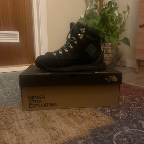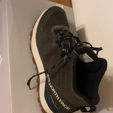 The North Face vinterstøvler i størrelse 42. Støvlene er svarte med lys såle og høy skaftkonstruksjon som gir støtte rundt ankelen. Overdelen er i tekstil og syntetisk materiale med snøring foran og hempe bak for enkel av- og påkledning. Yttersålen er mønstret for bedre grep på glatte underlag. Passer til bruk i kaldere vær og på vinterføre i hverdagen eller på tur.