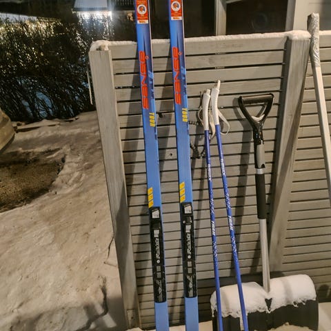 Staver, ski og støvler egner seg til klassisk langrenn for små barn på tur.