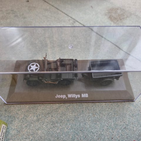 Jeep Willys MB modellbil med tilhenger i militærgrønn farge. Modellen viser en åpen Jeep Willys MB med detaljert interiør og påmontert henger. Den står montert på en merket sokkel med gjennomsiktig plastlokk. Egner seg som samlerobjekt eller utstillingsmodell.