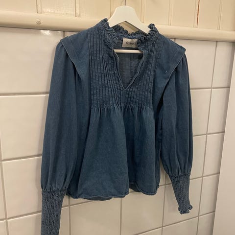 Neo Noir bluse i svart bomull for dame i størrelse 38. Blusen har volangdetaljer og knappelukking foran. Rynking over bryst og rygg gir en lett A-fasong. Lange ermer med knapper og volangkant ved mansjettene. Laget i vevd bomullsstoff med lett vasket uttrykk. Passer til hverdagsbruk og kan kombineres med både bukser og skjørt.