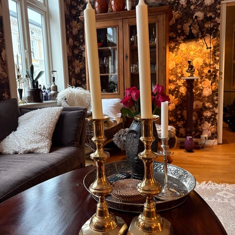 Lysestake i messing med dreid søyle og firkantet fot. Passer til bruk med stearinlys og kan plasseres på bord, hylle eller kommode som belysning og dekorasjon i hjemmet.