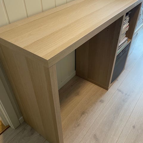 Romslig skrivepult i eikefiner med oppbevaringsdel på høyre side.