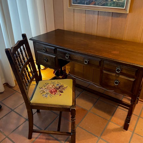 Pulten har en skuff med innvendige metallskinner og et skap med god plass til oppbevaring. Egnet som arbeidsbord eller skrivebord i hjemmekontor, stue eller soverom. Noe bruksmerker her og der. Ukjent merke.