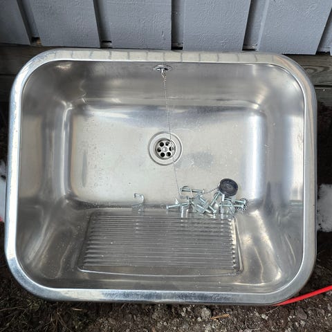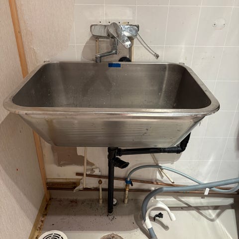 Vaskekum i stål med avløp i bunnen. Egner seg som grovvaskkum i garasje, bod eller vaskerom der det er behov for en robust kum til rengjøring av utstyr og lignende. Hel men trenger en vask/puss . 500 kr