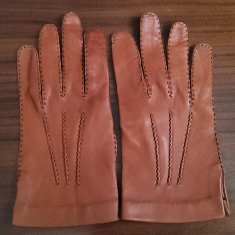 Brune, forete, myke skinnhansker i størrelse 10. Det synes at de er brukt på undersiden, men helt fine.