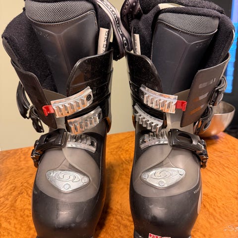 Salomon Evolution 9.0 alpinstøvler i størrelse 26.0 (EU 41, UK 7, US 9). Er nok nærmere 40 enn 41, tStøvlene er svarte med oransje innerfôr og flere justerbare spenner foran for god tilpasning. Modellen har Shock Absorber-demping i hælen for økt komfort ved kjøring.