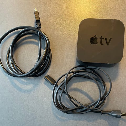 Apple TV Model A 1378. Original fjernkontroll, ikke synlig brukt. Strømkabel og HDMI-kabel følger med.