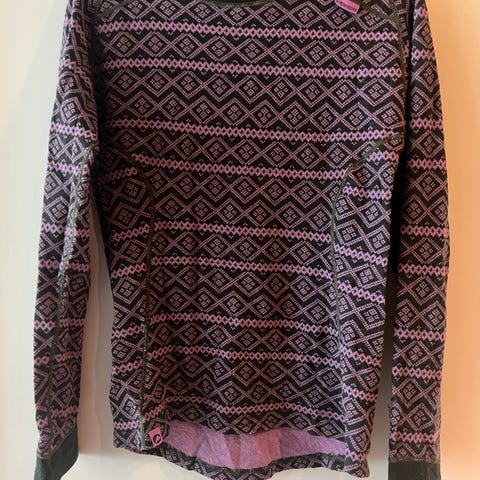 Bula Chill herretrøye i størrelse XL. Langermet modell med rund hals. Forsiden har blå/svart geometrisk mønster, mens baksiden er ensfarget mørk. Laget av 100 % polyester ifølge vaskelappen. Egnet som innerste eller mellomste lag til ulike aktiviteter og fritidsbruk.
